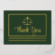 Simple, elegant and modern dark green graduation or professional attorney or other legal professional "Thank You" with real gold foil front law scales of justice and text with rectangular frame and double bottom lines and back black text postcard design with back template for return address. Original design by Holiday Hearts Designs (all rights reserved).