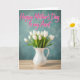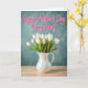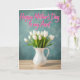 This card features a graceful bouquet of white tulips, mostly closed buds, rising from a smooth white ceramic pitcher like a quiet thank-you offered with care ❤️. The crisp petals contrast with bright green stems that lean and fan out naturally, giving the arrangement a gentle, affectionate energy. The pitcher sits on a warm wooden surface where the visible grain adds a cozy, homey setting that feels like family time. Soft, diffused light glides across the ceramic and flowers, creating a tender glow that suggests closeness without needing any extra fuss. Behind it all, a blurred teal background with faint light spots adds calm depth, like a peaceful room just out of focus 🌼. Across the upper area, the message “Happy Mother’s Day To my Aunt” is placed in flowing fuchsia lettering that stands out clearly against the cool background. The bright text balances the pale flowers and draws the eye upward, like a warm note spoken with a smile. The teal backdrop fades from darker edges to a lighter center with a few soft, bokeh-like highlights.