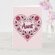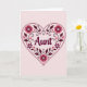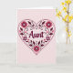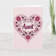 This greeting card features the word “Aunt” centered in a flowing cursive-style lettering with a soft light outline that makes it stand out gently. The word sits inside a large heart shape edged with a neat double-line border, creating a cozy frame that feels like a warm embrace ❤️. Inside the heart, layered floral and leafy decorations fill the space, with big rounded blossoms, smaller simple flowers, curling vines, and tiny scattered hearts that suggest closeness and affection. The color palette leans into rosy pinks, bright fuchsia tones, and deeper maroon accents, all set on a pale pink background that keeps the look soft and sweet 🌼. The text is placed right in the middle of the heart, while the decorative elements radiate around it like a bouquet arranged for someone special. Small star-like shapes and delicate leaves add extra sparkle and texture without crowding the main word. The heart’s interior is packed with petals, tendrils, and miniature heart details in pink, fuchsia, and maroon against the light pink backdrop.