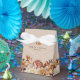 This elegant fall wedding favor box features hand-painted watercolor burnt orange and terracotta leaves, cream and beige dahlias, and beautiful rust-colored roses on a taupe background with the bride and groom's name and wedding date in brown text. Find matching items in the Taupe Autumn Romance Collection.