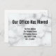 The top line of display text says 'Our office has moved'. You can personalize your moving announcement with your company's name, new address, and phone number. The moving announcement has a faux white marble design.