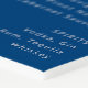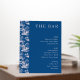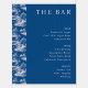 This is a minimalist style image featuring an elegant bar menu with a sophisticated blue and white color scheme. The left side showcases intricate, monochromatic botanical illustrations that add a touch of classic charm. On the right, the menu lists various beverages including beer, wine, and spirits in clean, modern typography against a deep blue background. It exudes a refined and inviting atmosphere, perfect for setting the tone at upscale gatherings or cozy evenings out.