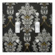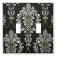 A luxurious and ornate damask pattern featuring intricate white and gold floral motifs on a black background. The design exudes a classic and sophisticated aesthetic, commonly found in vintage wallpapers, textiles, and high-end decor.