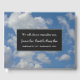 This minimalist funeral/memorial remembrance guestbook features the message "We will always remember you,", and the personalized name and birth/death dates of the individual who has passed away. It also features a gray and white clouds and blue sky background. It could be used to record condolences for the family and friends of somebody who has recently passed away.