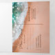 All in one Beach destination wedding trifold invitation featuring a summer tropical beach background, with palm tree leaves and string lights. You are able to add a personalized photo of you and your partner, the wedding details such as accomodation information and present requests, the invitation, and an rsvp postcard for your guests to cut off and send back.