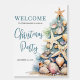 Welcome guests to your holiday gathering with this festive and beachy Christmas party welcome sign. The design features a large Christmas tree on the right made of beach shells, starfish, and coral, bringing a fun coastal touch to your celebration. The tree's soft green, tan, and coral-red details pair perfectly with the warm sandy base and teal blue water accents for a relaxed tropical vibe.