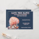 Set the tone for a beautifully refined coastal celebration with this elegant ocean-inspired design. Featuring delicate coral and seashell illustrations in soft coral, off-white, and pale blue tones, the artwork rests gracefully against a rich dark blue background for a striking, sophisticated contrast.