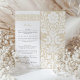 This beautifully designed wedding menu card adds a touch of sophistication to your reception with its elegant beige and ivory floral pattern. The card features a classic floral motif that enhances the luxurious feel of your wedding table settings. The front of the card presents the menu in a refined layout, allowing your guests to anticipate the delicious courses to come, while the back showcases the intricate floral design, ensuring a cohesive and stylish look. Perfect for traditional or vintage-inspired weddings, this menu card seamlessly integrates with your overall wedding decor, making it a memorable part of your special day.