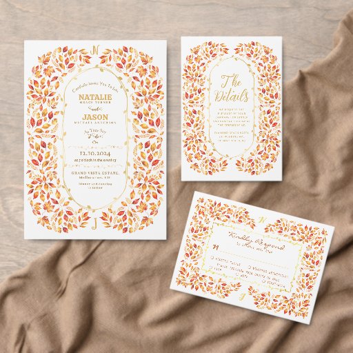 Elegant Beige Fall Leaves Rustic Boho Wedding Foil Invitation