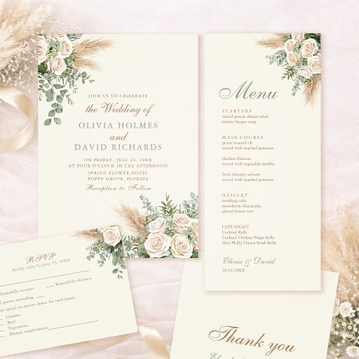 Add a refined and personalized touch to your wedding table with these elegant beige pampas grass wedding napkins. Designed with soft ivory roses, delicate greenery, and natural pampas accents, this napkin perfectly complements boho, rustic, and neutral wedding themes.