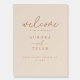 A modern, beige/tan wedding welcome sign, designed with script lettering. Personalize with your names, location, and date.