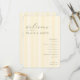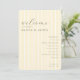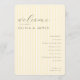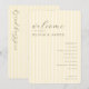 This elegant wedding program features a minimalist design with a light beige background and subtle diagonal stripes. The layout is vertically structured, showcasing the word "welcome" in an elegant cursive script at the top, followed by bold uppercase names for the couple. A clean sans-serif font lists the ceremony schedule on the right side, providing clarity and organization. The neutral color palette creates a calm and inviting atmosphere, perfect for a formal event. Ideal for couples seeking understated sophistication, this program combines simplicity with refined typography to set the tone for their special day.