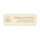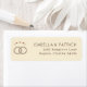 This return address label features a minimalist and elegant design with a beige background, creating a warm and sophisticated aesthetic. The layout includes overlapping circular designs resembling wedding rings on the left, adorned with small dotted patterns, while an arc of red hearts adds a touch of color above them. On the right side, customizable text is presented in a clean serif font, offering a formal yet modern look. The overall style blends classic elegance with contemporary simplicity, making it perfect for weddings or special occasions that celebrate love and unity.