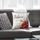 This elegant "Believe" Christmas pillow features a beautiful red floral design with the word "Believe" in modern typography script. Personalize it with your name and date.