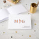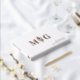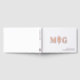 Monogrammed wedding guestbook in white with your initials separated by a rose gold berry twig with your wedding date and location written in the bottom corner and your names on the spine in rose gold against a white background. Ask your guests to write down their messages and heartfelt wishes on your wedding date in this rose gold and white wedding guestbook personalized with your monogram, wedding date, and location with elegant berry twig details.