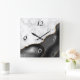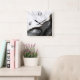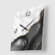 Elegant modern white marble and black agate trimmed with faux gold glitter combine in this luxurious square wall clock. The numbers 3 and 6 appear in light gray on the black agate background, while the numbers 9 and 12 appear in black on the white marble.