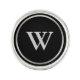 A faux (not foil) silver border surrounds a faux silver letter. You can change the letter to show the correct initial on this monogrammed lapel pin. The monogram is on a black background.