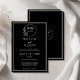 Elegant Black and White Floral Monogram Wedding Invitation. Announce your upcoming marriage with this beautiful minimalist designed wedding invitation. The deep black background provides a striking contrast to the charming script font used for your custom names and the delicate floral accents. A distinguished greenery monogram at the top adds a personal touch, making this invitation uniquely yours. Every detail, from the date and time to the reception information, is presented with clarity and style, creating an unforgettable first impression for your guests.