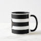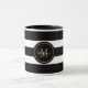 Enjoy your morning coffee in style with this Elegant Black And White Stripes Script Monogram Mug. This classy design has black and white horizontal stripes with black circle border on the front center. Your monogram is in faux gold minimal lettering and personalized with name in white trendy hand lettered script. Click personalize template option and follow the prompts.