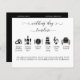 Elegant modern black and white wedding timeline program with beautiful timeline icon images in black, white, gray and taupe hues and elegant modern handwritten calligraphy details. Ability to select customize and move around timeline images and text to suit your own wedding timeline, simply drag and move. Personalize dinner image with your own initials. Back in black "background color" (which can be changed to any other color you like by selecting "customize further") and white text with the ability to customize back information to add wedding program and wedding party names or any other information you like.