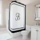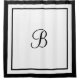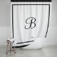 A bold, striking shower curtain featuring a single script monogram initial framed by a crisp black border on a clean white background. The high-contrast black and white palette delivers a dramatic, modern take on the classic hotel-inspired design. A chic gift for new homeowners or anyone who appreciates graphic, sophisticated bathroom decor. The initial is fully customizable.