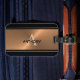 Travel in class and style with this Elegant Black Bronze Metal Monogram Name Luggage Tag. It is designed with a modern masculine faux metallic bronze, gold and black stripes background and personalized with name in bold black lettering and your initial in light beige.