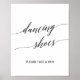 This elegant black calligraphy dancing shoes sign is perfect for a simple wedding. The neutral design features a minimalist poster decorated with romantic and whimsical typography.