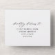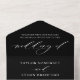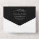 Elegant black and white all in one wedding invitation with sweeping calligraphy script and classic serif typography. The front features "Wedding Of" in flowing hand-lettered style over a dramatic black background, with event details below and a detachable RSVP postcard with meal selection options. The back side can be individually personalized with each guest's name and address for direct mailing — simply fold, seal with the included stickers, and send. The back flap displays a delicate botanical leaf sprig with your return address. All text and colors are fully editable to coordinate with your wedding palette.
