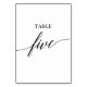 This elegant black calligraphy table five table number is perfect for a simple wedding. The neutral design features a minimalist card decorated with romantic and whimsical typography. The card prints on the front and back (double-sided). Other table numbers in the collection are sold separately.