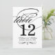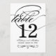 Sweeping black calligraphy and graceful flourishes on a clean white background bring dramatic sophistication to this wedding table number card. The bold flowing script creates a timeless centerpiece for formal and black-tie reception tables. The couple's names, wedding date, and table number are easy to personalize. Each table number must be individually personalized and added to the cart one at a time.