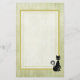 Elegant black cat posing with one paw raised. Has a cute curly tail and is wearing a fancy choker. The background is a faded aged looking striped paper in a yellowish green color. The center has a rectangle with a double gold border with a transparent white overlay for you to write your message inside.