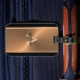 Travel in style with this Elegant Black Copper Monogram Name Mens Luggage Tag. This design is a modern masculine faux metallic copper, bronze, gold and black stripes background. It is personalized with name in bold black lettering and your initial in light beige on the center.