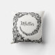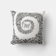 This decorative pillow design features a sophisticated black damask swirl pattern set against a crisp white background. The ornate frame spirals toward the center, where a circular damask wreath encloses an editable monogram initial. Its timeless black-and-white palette gives it a classic yet versatile appeal, perfect for adding elegance to living rooms, bedrooms, or as a personalized gift for weddings, anniversaries, and housewarmings.