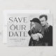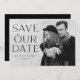 Trendy, elegant save the date announcements displaying your favorite horizontal engagement photo with "Save our Date" in a stacked, black text overlay featuring a diamond ring letter "o". Personalize the front of the photo save the date card by adding your names, wedding date, and city/state. The back of the card features a solid black background or change to a color of your choice.