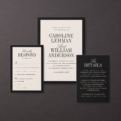 Plain white envelopes are included with paper invitations and will come to fit the invitation size you select. If you don’t need the envelopes, you may choose to not receive them by selecting the dropdown below "Envelopes" and choosing "None." If you’d like to have a design on your envelopes, you can browse all of these available envelopes to find the design that complements your Elegant Black Double Sided Wedding Invitation.