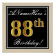 This simple and elegant birthday party poster design features a personalized message like "ANameHere’s 88th Birthday!" (with the "88th" having a faux/imitation gold-like coloring look) within a black-colored square area featuring a simple border outline. The name is in an elegant white-colored script-like text, and can be customized. A personalised birthday party poster like this could perhaps be used as a decoration at a party being held for somebody who is celebrating their eighty eighth birthday. [~Z0000236]