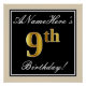 This simple and elegant birthday party poster design features a personalized message like "ANameHere’s 9th Birthday!" (with the "9th" having a faux/imitation gold-like coloring look) within a black-colored square area featuring a simple border outline. The name is in an elegant white-colored script-like text, and can be personalized. A personalised birthday party poster like this could perhaps be used as a decoration at a party being held for somebody who is celebrating their ninth birthday. [~Z0000236]