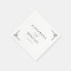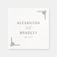 This wedding napkin features a minimalist and elegant design with a clean white background. The layout includes bold, uppercase serif typography for the names, complemented by a cursive script for "and," creating a sophisticated contrast. Decorative geometric elements in the corners add subtle visual interest without overwhelming the central text. The monochromatic color palette of black on white emphasizes clarity and modernity, making it perfect for formal occasions that celebrate simplicity and grace.