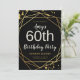 Celebrate this remarkable milestone in style with this elegant black and gold 60th birthday party invitation. The luxurious geometric gold accents and modern typography create a sophisticated, upscale look perfect for any formal or semi-formal celebration. Personalize the name, age, date, location, and RSVP details to make it uniquely yours. Ideal for glamorous birthday parties, evening events, and milestone celebrations.
