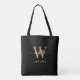 Girly Simple Elegant Modern Black and Gold Monogram Initial Name Signature Script Custom Personalized Tote Bag. This design featuring your first name in a pretty hand lettered style swash tail font typography (or calligraphy) with monogram initial and family name or full name in gold and white on black background. Great feminine gift for birthday, wedding, Christmas, bridal shower, sweet 16 birthday party, bachelorette party or for graduation and It’s for the girl who likes minimalist clean things.