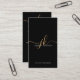 Elegant Black Gold Monogram Script Initials Business Card. Modern, stylish, custom color vertical business card featuring an elegant calligraphy swash script monogram with one or two letters in your choice of text and background colors (shown in gold initials and white text on a black background). ASSISTANCE: For help with design modification or if you would like coordinating items, contact the designer BEFORE ORDERING via the Zazzle Chat MESSAGE tab or email makeitaboutyoustore@gmail.com.