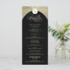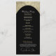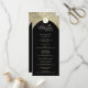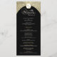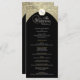 This wedding program showcases a dramatic black background accented with ornate golden damask flourishes, creating a design that is both timeless and luxurious. At the top, a decorative crest adds a refined touch, while the central layout displays the couple’s names and wedding service details in a clear and elegant format. The rich combination of black and gold conveys sophistication and grandeur, making this program card ideal for formal, traditional, and evening wedding celebrations.