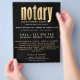 Elegant, trendy flyer for notary loan signing agent featuring black & gold pattern background and handwritten calligraphy script ''notary' in deep gold color. Personalize with your details.