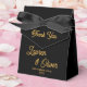 Treasure your big day in style with these Elegant Black Gold Script Minimalist Wedding Favor Boxes! The chic gold script adds a touch of sophistication, perfect for a romantic black tie affair. Customized with your names and wedding date, these keepsakes will be cherished by guests for years to come.