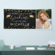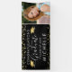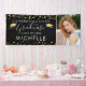 Modern graduation banner featuring an elegant handwritten script typography title CONGRATULATION TO OUR GRADUATE, faux metallic gold foil graduation caps or mortarboards, gold glitter confetti and string lights and your graduate's photo, name and class year against an editable black background color you can easily change to a school color, party theme color or favorite color by clicking CUSTOMIZE FURTHER in the PERSONALIZE section. ASSISTANCE: For help with design modification/personalization, color change, transferring the design to another product or if you would like coordinating items, contact the designer BEFORE ORDERING via the Zazzle Chat MESSAGE tab or email at makeitaboutyoustore@gmail.com.