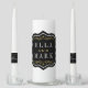 Elegant black and gold scrollwork wedding unity candle set showcasing a monogram of the couple's names in bold spaced lettering with a decorative "and" on a rich black background with ornate gold scroll detailing. The luxurious contrast creates a stunning ceremony accent. Coordinating scrollwork taper candles tie the design together. All text is easy to personalize.