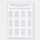 This wedding seating chart features a clean, grid-based layout with a sophisticated and organized design. The color palette is minimalistic, utilizing black text on a white background for maximum clarity and readability. Elegant serif fonts are used for the header, while sans-serif fonts provide a modern touch for the table listings. Perfect for guiding guests at a formal event, this chart combines functionality with an understated elegance, ensuring a smooth and stylish experience for everyone involved.