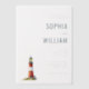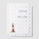 This elegant wedding invitation features a minimalist design with a black background, creating a striking contrast for the crisp white text and colorful lighthouse illustration. The layout is clean and sophisticated, with customizable placeholders for names, dates, and locations, ensuring personalization while maintaining an overall formal tone. The lighthouse motif adds a touch of charm, symbolizing guidance and celebration, perfect for a memorable event. With its modern typography and subtle color palette of red and yellow accents, this invitation exudes a sense of elegance and simplicity, ideal for couples looking to make a stylish statement on their special day.