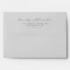 This wedding envelope features a minimalist design with a clean, centered layout on a plain white background. The elegant script font for names is complemented by a simple serif font for the address and contact details, creating a sophisticated and modern look. The black text on a white background emphasizes clarity and refinement, making it ideal for formal invitations. With its understated style and generous use of negative space, this envelope conveys a sense of calm elegance, perfect for special occasions.