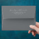This wedding envelope features a minimalist and elegant design with a sophisticated black background and crisp white text. The layout is centered, creating a balanced and symmetrical appearance that highlights the names in an elegant cursive script at the top, followed by neatly aligned address details in a clean sans-serif font. The modern style emphasizes clarity and simplicity, making it perfect for couples seeking a refined and timeless look for their special day.